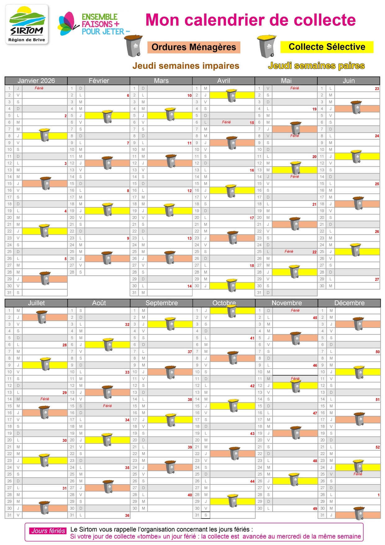Comme chaque année, le calendrier de collecte du SIRTOM 2026 sera distribué avec le Bulletin Municipal